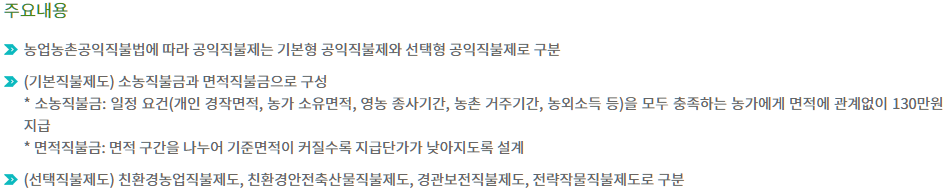 직불금 종류에는 선택형과 기본형으로 나눠져 있는데 통상적으로 기본형으로 가장 많이 지원을 합니다. 기본형에는 손오직불제와 면적직불제로 구분되는데 소농직불제는 경작면적과 농촌거주기간 등 요건들이 모두 충족되면 농가 면적과는 상관없이 130만 원을 받을 수 있습니다.