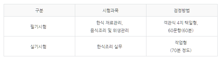 한식조리기능사의 시험은 필기시험은 총 2과목으로 4지 택일형 60문제로 구성되어 있습니다. 여기서 합격 기준은 과목 당 40점 이상 & 전 과목 평균 60점 이상입니다.